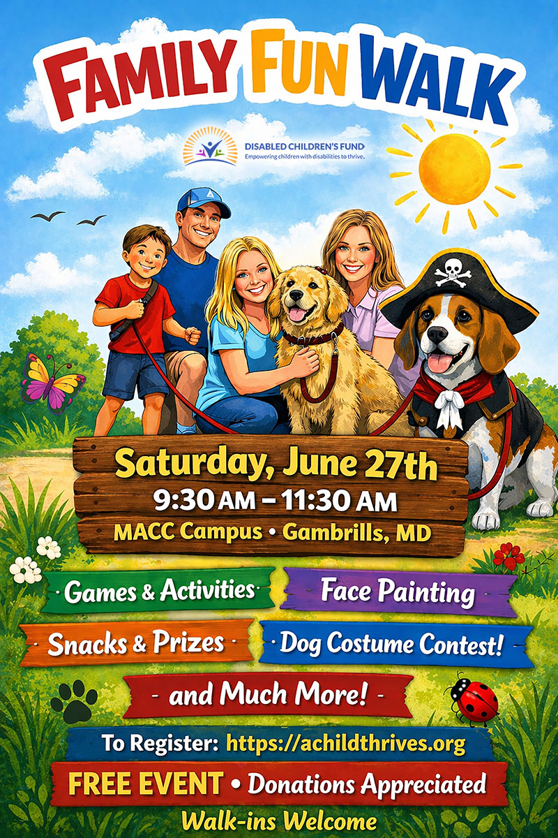Disabled Children’s Fund is sponsoring a fundraiser which is family focused with the family’s sociable dogs welcomed. Our mission is to bring people together with their families and friends to experience a time of fun and fellowship for the purpose of raising funds to support Compassion Care for Disabled Children Inc. dba Disabled Children’s Fund, in their global outreach to Change the World for a Disabled Child.